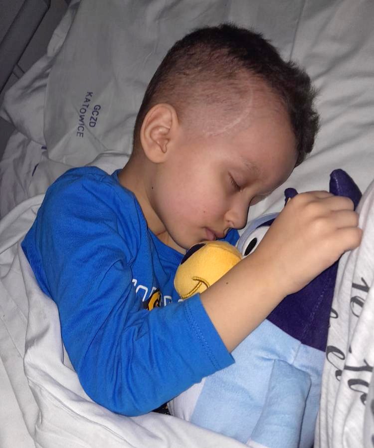 18.02.2025r. Misio przeszedł pierwszą operację, gdzie została usunięta połowa guza. Po 9 dniach wróciliśmy do domu, lecz nie na długo, gdyż stan malucha gwałtownie się pogorszył. Pojawiły się silne bóle głowy, wymioty, napady padaczkowe. 03.03.2025r powrót do Katowic, tomograf wykazał wodniaki w miejscu usuniętej części guza, natychmiast wykonano drenaż zewnętrzny przestrzeni przymózgowej a następnie 05.03.25r Misio po raz kolejny trafił na stół operacyjny, gdzie została usunięta pozostała część guza. Niestety, po operacji nastąpił całkowity niedowład lewostronny. Nasz wojownik wylądował na wózku. Rezonans wyszedł pozytywny, guz został usunięty w całości. Nasz bohater wrócił do domu, do braciszka. Po 3 tygodniach od operacji zaczął stawiać swoje pierwsze kroki. Lecz szczęście nie trwało długo.